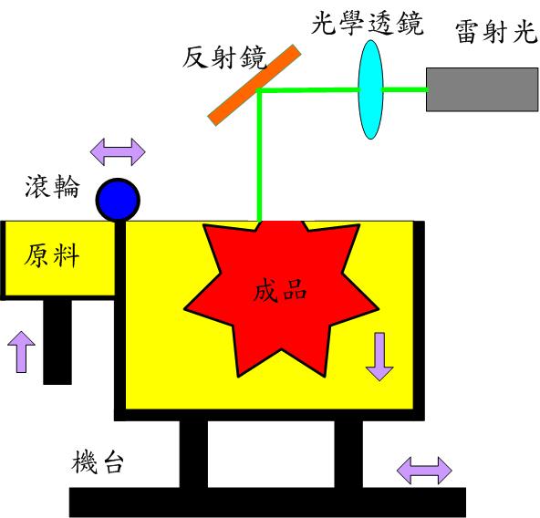 此方法以液態聚合物為基本材料,以雷射光或紫外光照射達到固化。