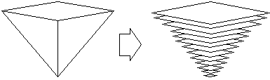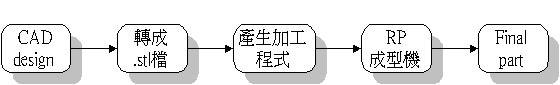 快速成型之製程(圖B):當一概念之設計完成於電腦之3D CAD軟體後,經一介面程式將此CAD model轉成STL檔或依不同RP機型有不同接受之格式,再經過一Slicing軟體計算將STL檔轉換成一層一層之2D剖面加工程式(圖C),再傳入RP機器後,工件就被一層一層的加工、堆疊並結合起來,如此一來即可製成3D之Part。 |